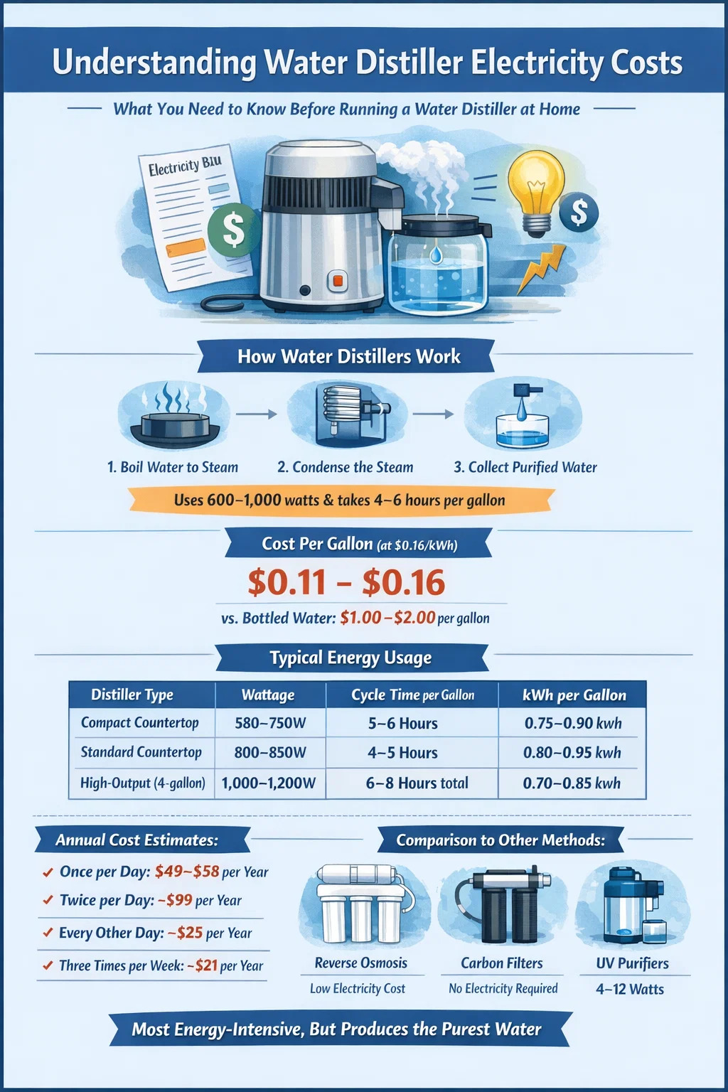 Un sistema de ósmosis inversa estándar debajo del fregadero utiliza una bomba de refuerzo eléctrica que extrae aproximadamente 24 a 80 vatios solo mientras se produce agua activamente, normalmente de 15 a 30 minutos por día para la mayoría de los hogares. Esto equivale aproximadamente a entre 0,006 y 0,04 kWh por día, lo que hace que el funcionamiento de los sistemas de ósmosis inversa sea mucho más económico que los destiladores de agua. El costo anual de electricidad para un sistema de ósmosis inversa a menudo es menos de $3 . Dicho esto, la ósmosis inversa no elimina todos los compuestos orgánicos volátiles (COV) ni ciertos gases disueltos como lo hace la destilación, y los sistemas de ósmosis inversa desperdician un volumen importante de agua en forma de salmuera, normalmente de 3 a 4 galones de aguas residuales por cada 1 galón de agua purificada producida.