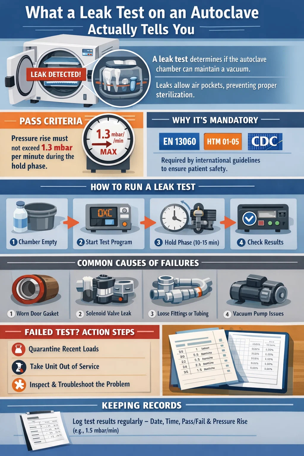 El punto de referencia pasa/falla para la mayoría autoclave dental modelos es un aumento de presión de no más de 1,3 mbar (0,13 kPa) por minuto durante la fase de retención de la prueba de fuga. Algunos fabricantes establecen un límite más estricto de 1,0 mbar por minuto. Cualquier lectura por encima del umbral establecido por el fabricante significa que el ciclo no debe continuar hasta que se identifique y corrija la fuente de la fuga.