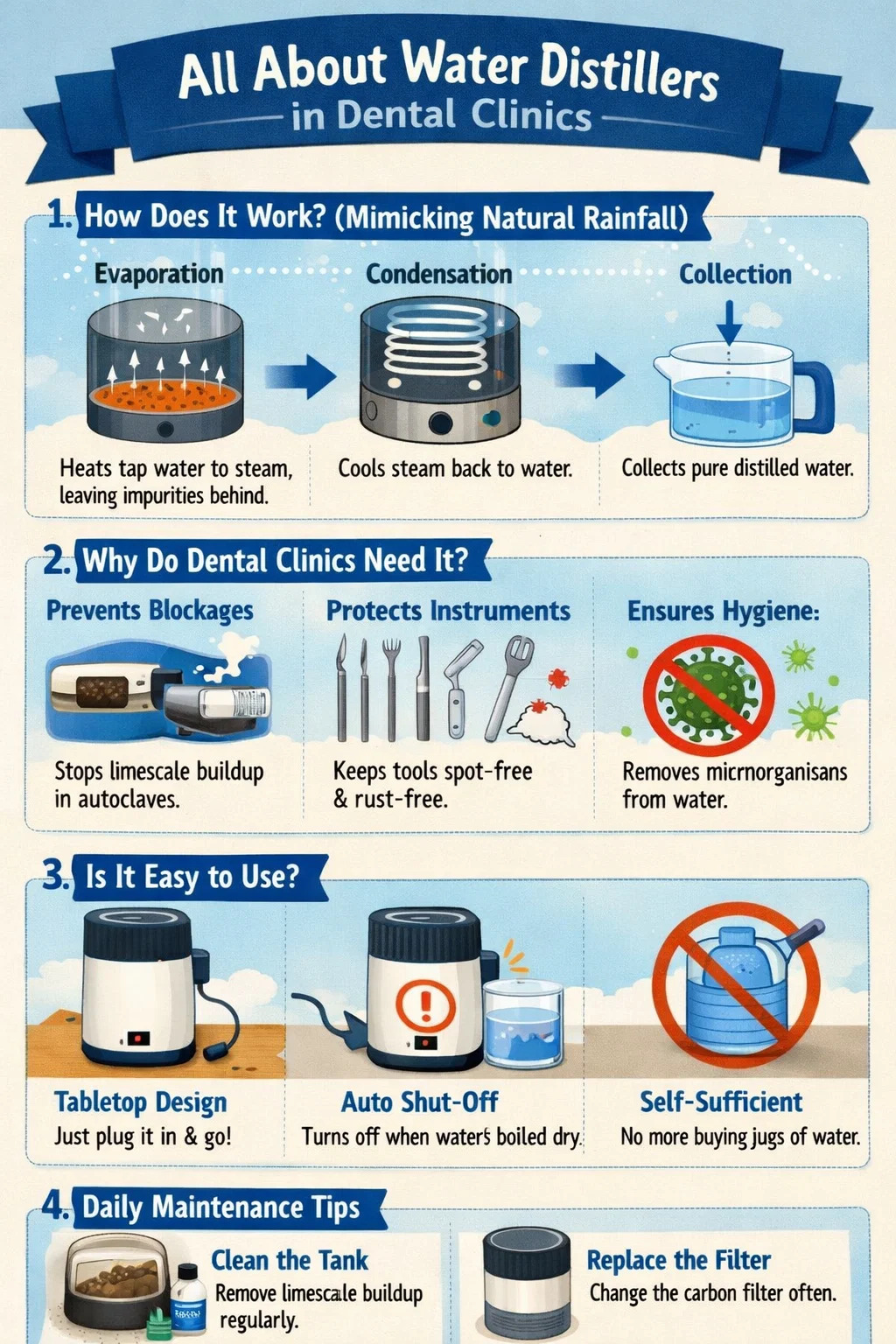 un destilador de agua Es esencialmente una pequeña fábrica dedicada a producir "agua pura". En las clínicas dentales suele ser el mejor compañero para los autoclaves dentales, porque los autoclaves son muy "exigentes" con el agua que utilizan y sólo pueden utilizar agua destilada limpia.