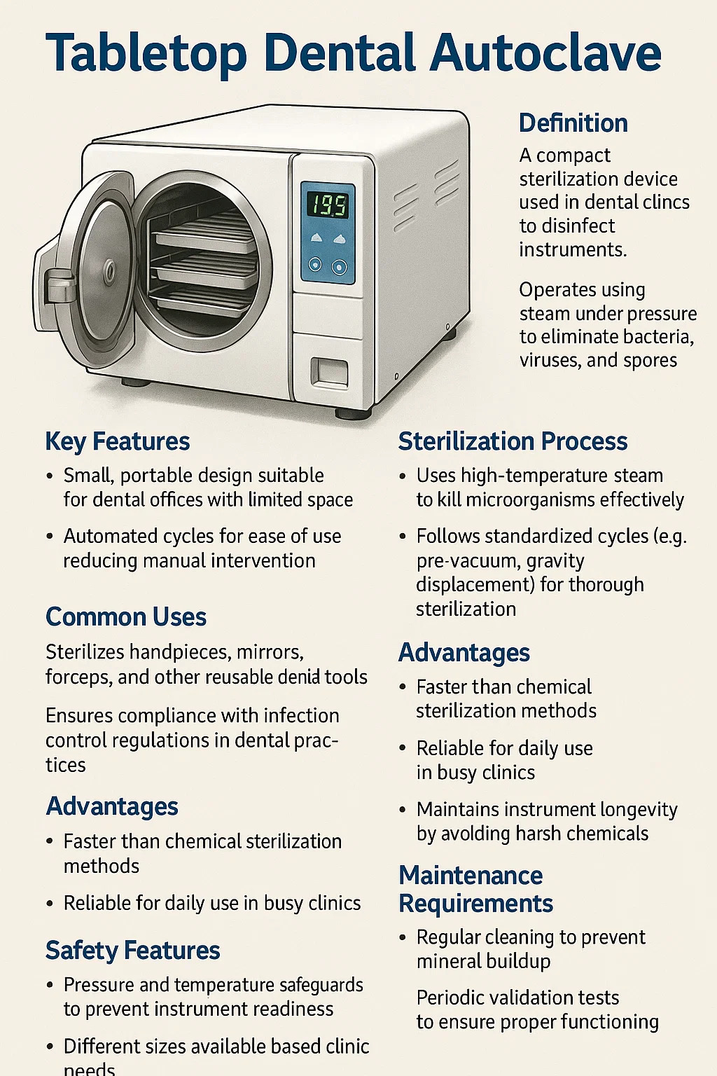 Esteriliza piezas de mano, espejos, fórceps y otras herramientas dentales reutilizables.