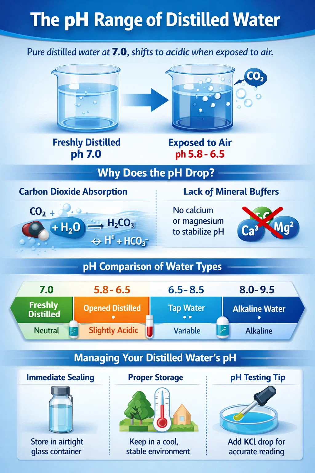 A diferencia del agua del grifo, que contiene calcio y magnesio que actúan como amortiguadores naturales para mantener estable el pH, el agua destilada tiene una capacidad amortiguadora nula. En consecuencia, incluso una pequeña cantidad de gas absorbido provoca una cambio significativo en el pH . Esta es la razón por la que analizar el agua destilada con una tira de pH estándar a veces puede producir resultados frustrantemente inconsistentes.