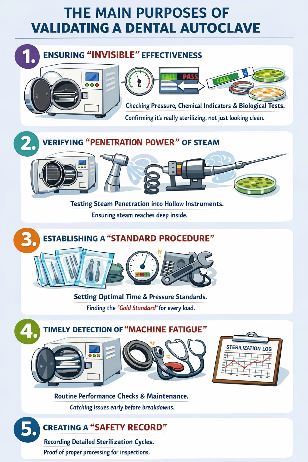 El papel de la validación: a través de pruebas, determina cuánto tiempo necesita funcionar la máquina y a qué presión para que sea más efectiva cuando se carga con una cantidad específica de instrumentos. Esto proporciona un "estándar de oro" reproducible para el funcionamiento diario.
