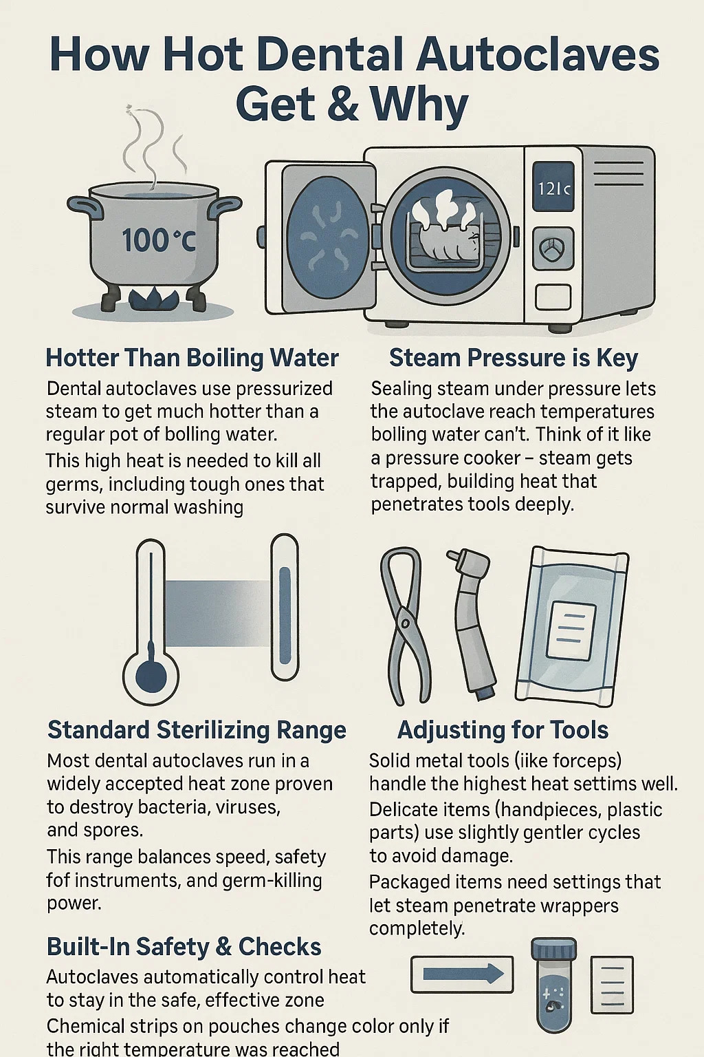 Los autoclaves dentales utilizan vapor a presión para calentarse mucho más que una olla normal de agua hirviendo.