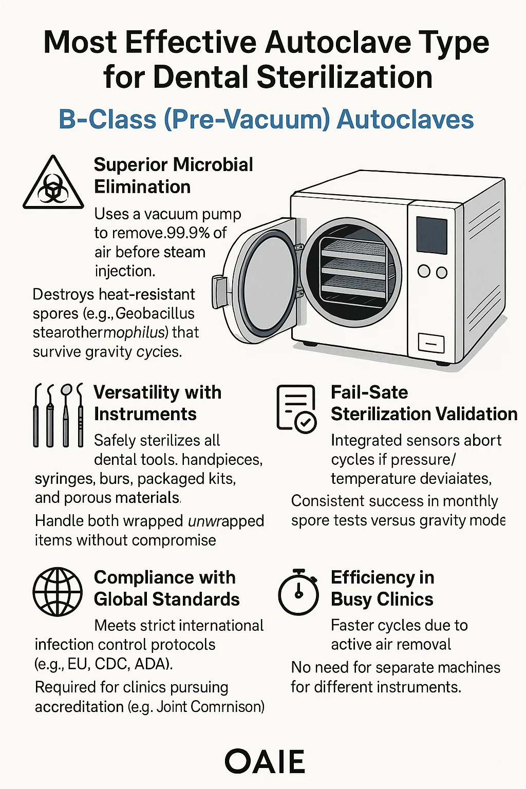Esteriliza de forma segura todas las herramientas dentales: piezas de mano, jeringas, fresas, kits empaquetados y materiales porosos.